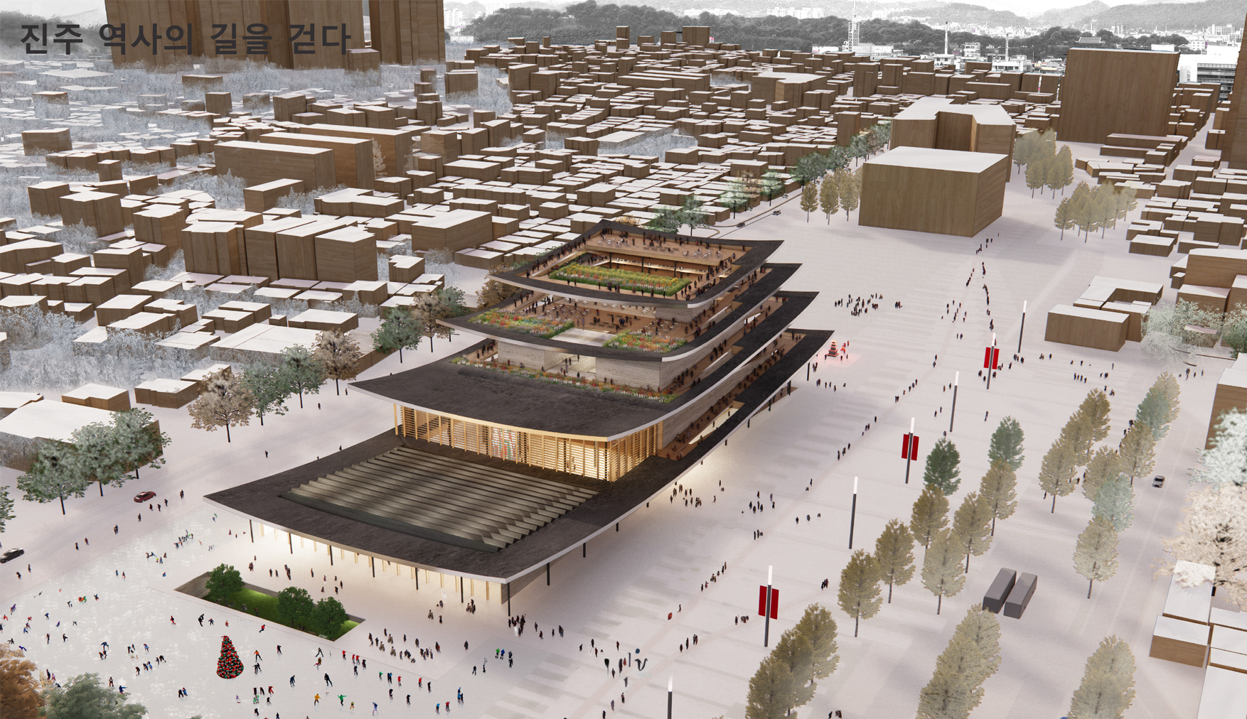 대상지는 과거 철도교통의 요충지로서의 독특한 도시적 배경을 갖고 있으며 '진주대첩' 라는 역사적 배경을 갖고 있는 진주성과 1.4KM 떨어져 있다. 진주의 유서깊은 역사 성지인 진주성과 촉석루를 조망할 수 있는 사이트의 입지적 특성을 반영하여 박물관 투어의 마지막 종착지로서 레스토랑, 카페테리아, 뮤지엄샵과 함께 주변 경관을 전망할 수 있는 옥상정원을 박물관 상부에 계획하여 인근 저층형 밀집주거단지 넘어 실존하는 역사와 시각적인 교류를 할 수있는 역사 전문 박물관인 진주박물관만의 독특한 공용공간을 계획한다.