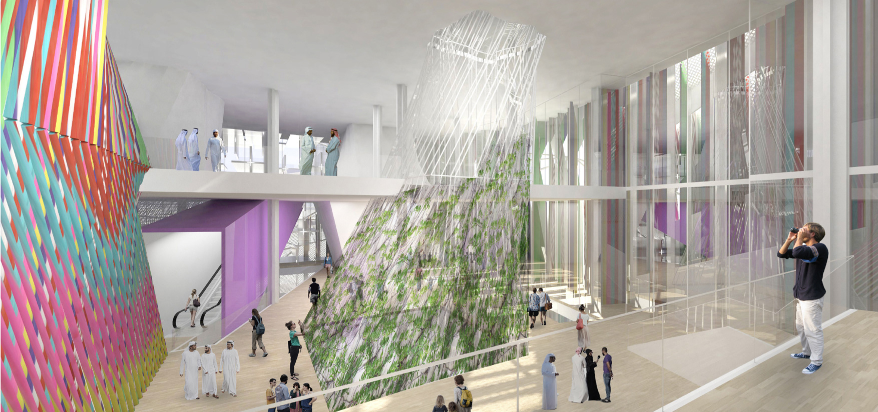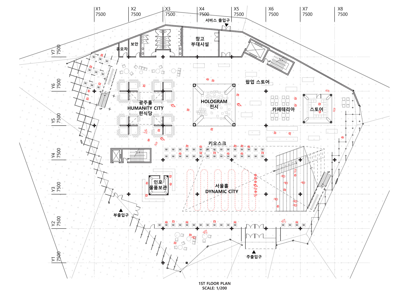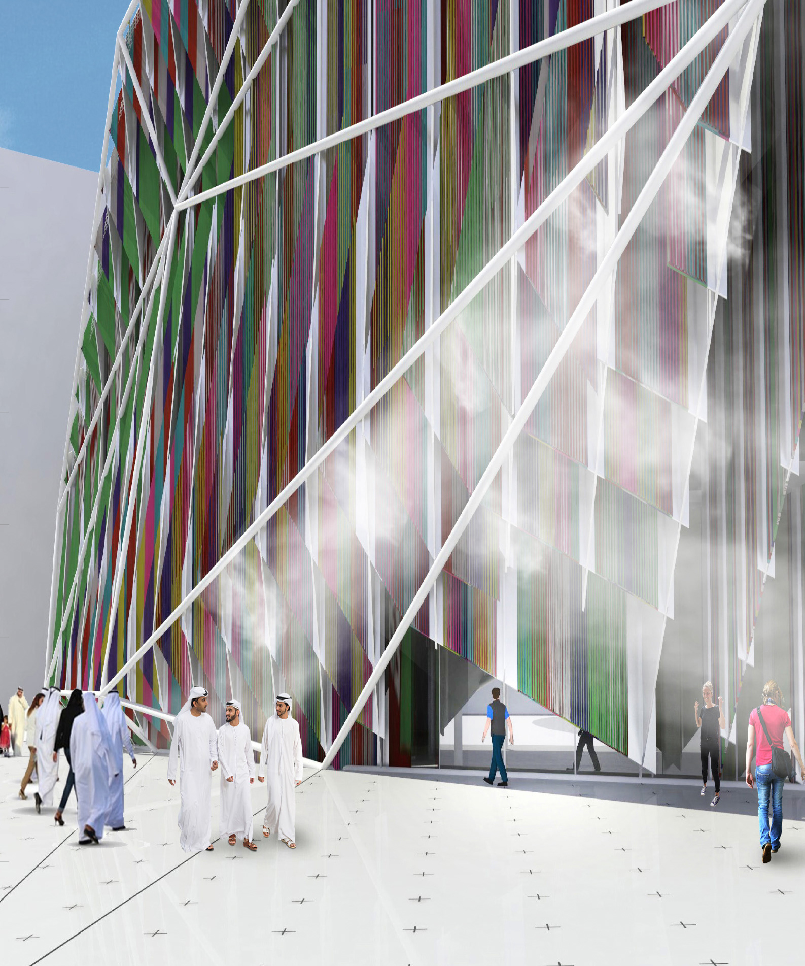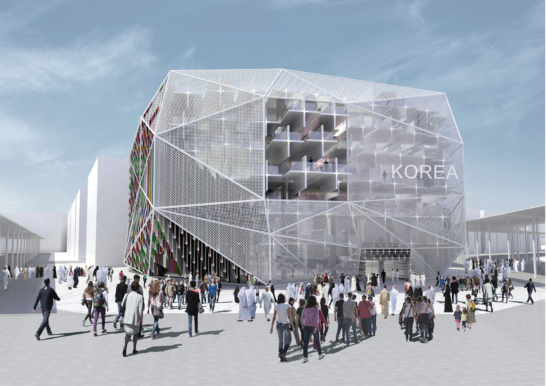 Mobility는 개인의 일상생활과 산업에서 모두 중요한 역할을 한다. 개인으로서, 우리는 풍부한 디지털 (digital) 정보와 물리적(analog) 정보를 동시에 경험한다. 우리는 일상을 데이터로 분석하고 기록하여 삶의 질을 향상 시키기 위해 노력하는 과정속에서 살아간다. 산업에서의 디지털 이동성(digital mobility)은 이제는 필수적인 흐름이며, 하나의 의사 결정을 위해 무한한 정보들이 유입되고 분석된다. 이와 같은 방법으로 도시들은 디지털로 재 연결되며, 급속한 운송 수단 개발로 '연결성'은 현실의 물리적 영역으로 확장된다. 이와 같이 Mobility는 디지털과 물리적인 정보를 통합 이용할 때, 다른 공간 사이의 시간을 경험하게 하는 Threshold의 역할을 한다. DYNAMIC THRESHOLD CITIES는 디지털 정보의 특성을 이용하여 물리적 형태를 구현하는 방식으로 디자인을 제안한다. 이를 통해 방문객은 디지털 기술을 간접적으로 경험할 수 있으며, 전시와 함께 한국의 여러 대도시의 특성을 직접적으로 체험케 한다. 또한 우리는 역동적이고 문화적으로 유서 깊은 한국의 정체성을 표현하기 위해 한국의 전통 의상의 생생한 컬러를 영감으로 삼았다. 동시에, 기후와 대기오염과 같은 우리 시대의 임박한 환경 문제 에 대한 건축 솔루션을 고려하고 제안한다.