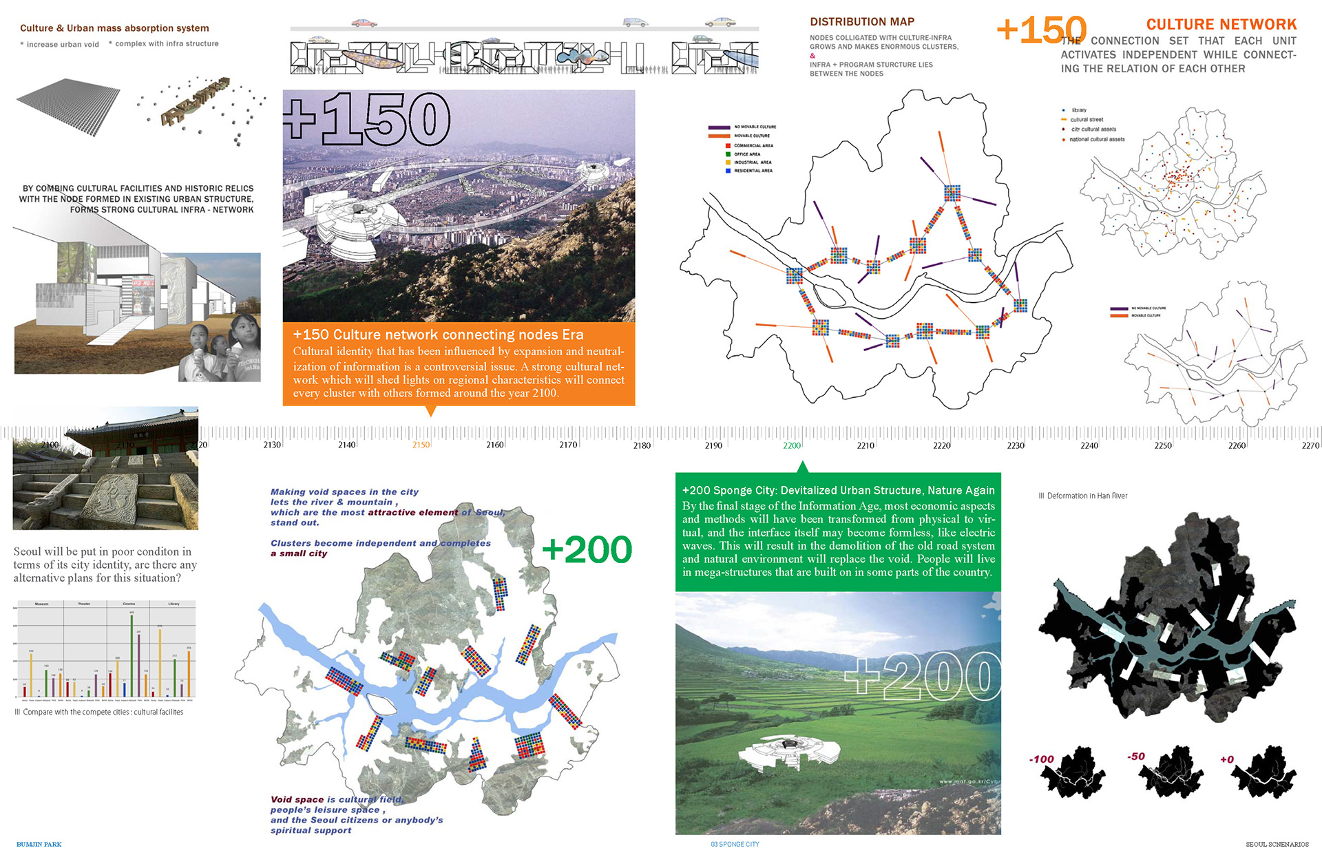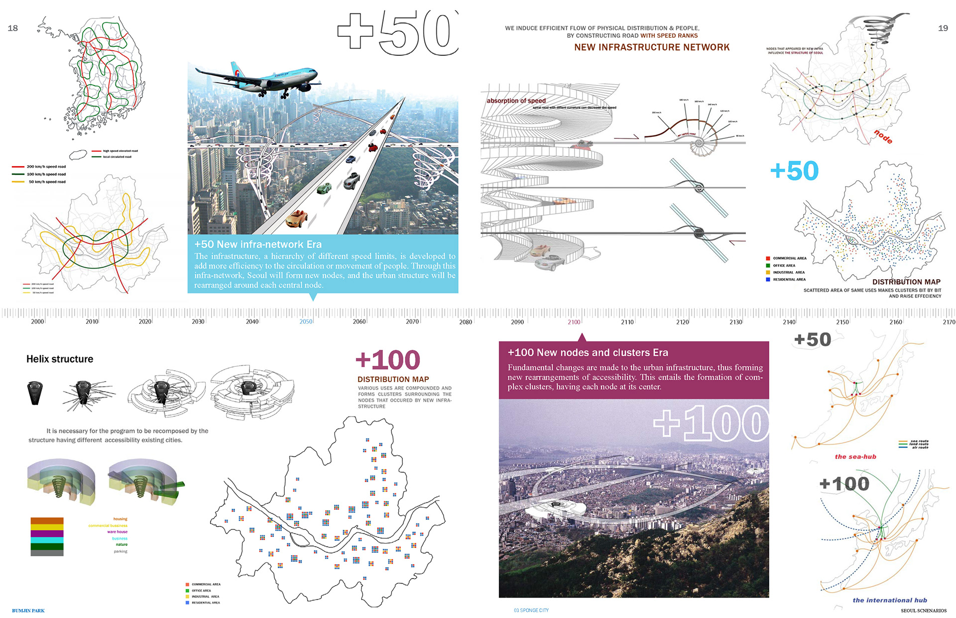 The infrastructure, a hierarchy of different speed limits, is developed to add more effi ciency to the circulation or movement of people. Through this infra-network, Seoul will form new nodes, and the urban structure will be rearranged around each central node.