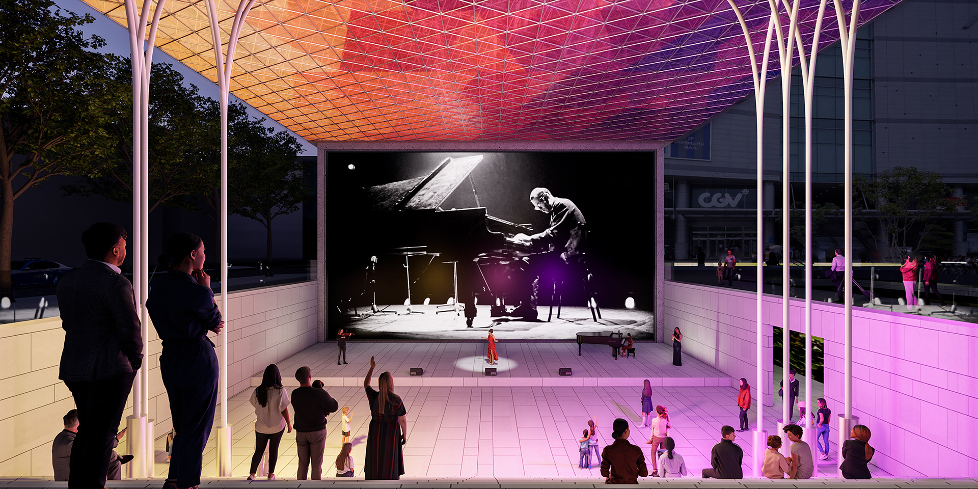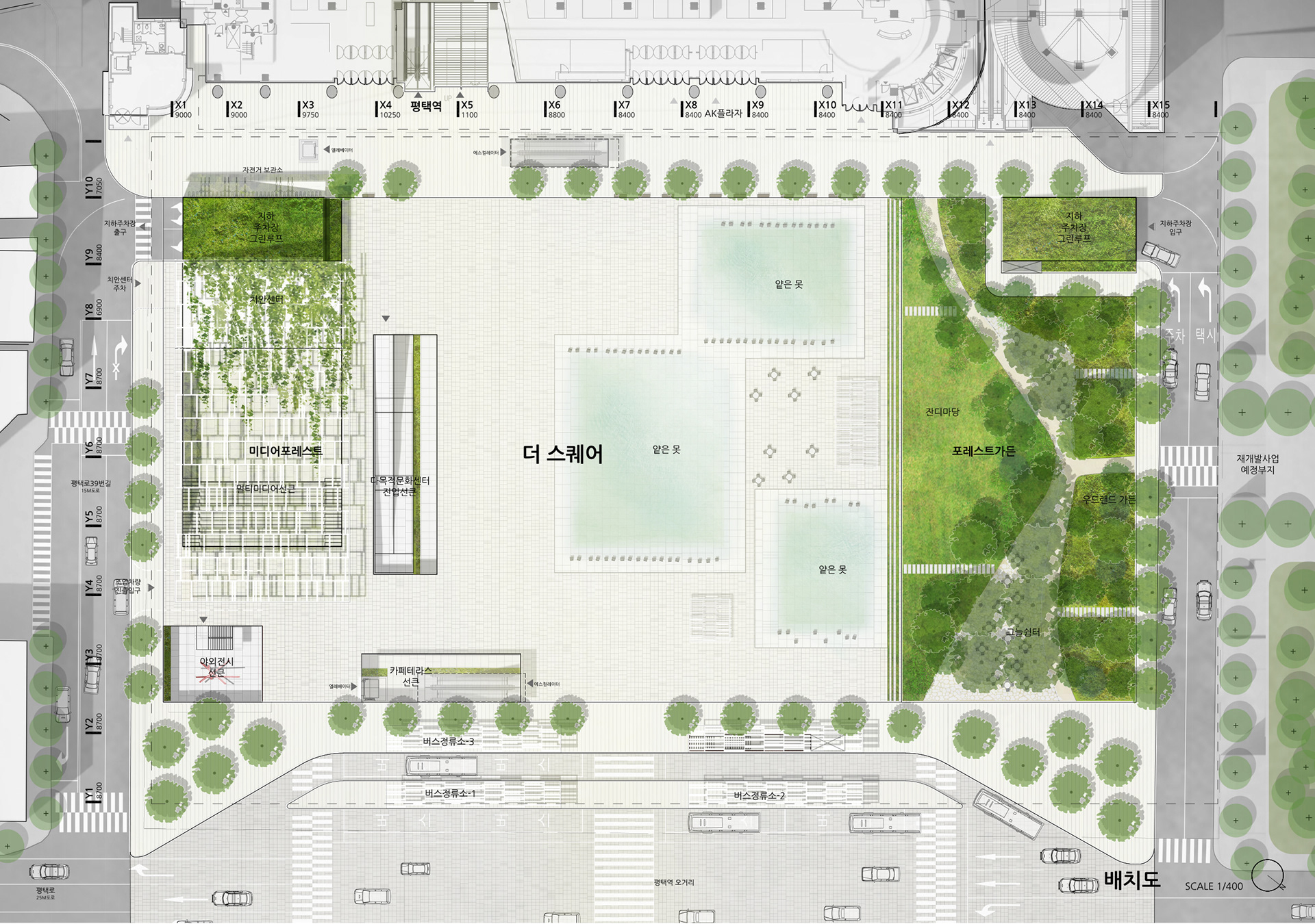 비워진 광장 양끝단으로 위치한 문화 프로그램, 주변 상황과 연계하여 광장을 푸르게 채운다. 자연 채광과 환기로 쾌적한 친환경 선큰을 중심으로 이루어진 복합 문화 공간, 미디어 포레스트라고 부른다. 사람의 이동이 가장 활발한 두개의 지점인 평택역 입구와 버스 환승센터를 네개의 거대한 선큰광장을 통해 긴밀하게 연계시킴으로서 광장 내에서 가장 활력있는, 즐겁게 머물고 싶은 장소로 계획한다. 미디어 포레스트의 중심 공간인 계단식 공연장은 시민에게 개방된 문화 창작 플랫폼으로서 공연 및 이벤트, 각종 전시를 수용하며, 전면 스크린을 통해 디지털 컨텐츠를 상영할 수 있는 다목적 멀티미디어 스페이스이다.