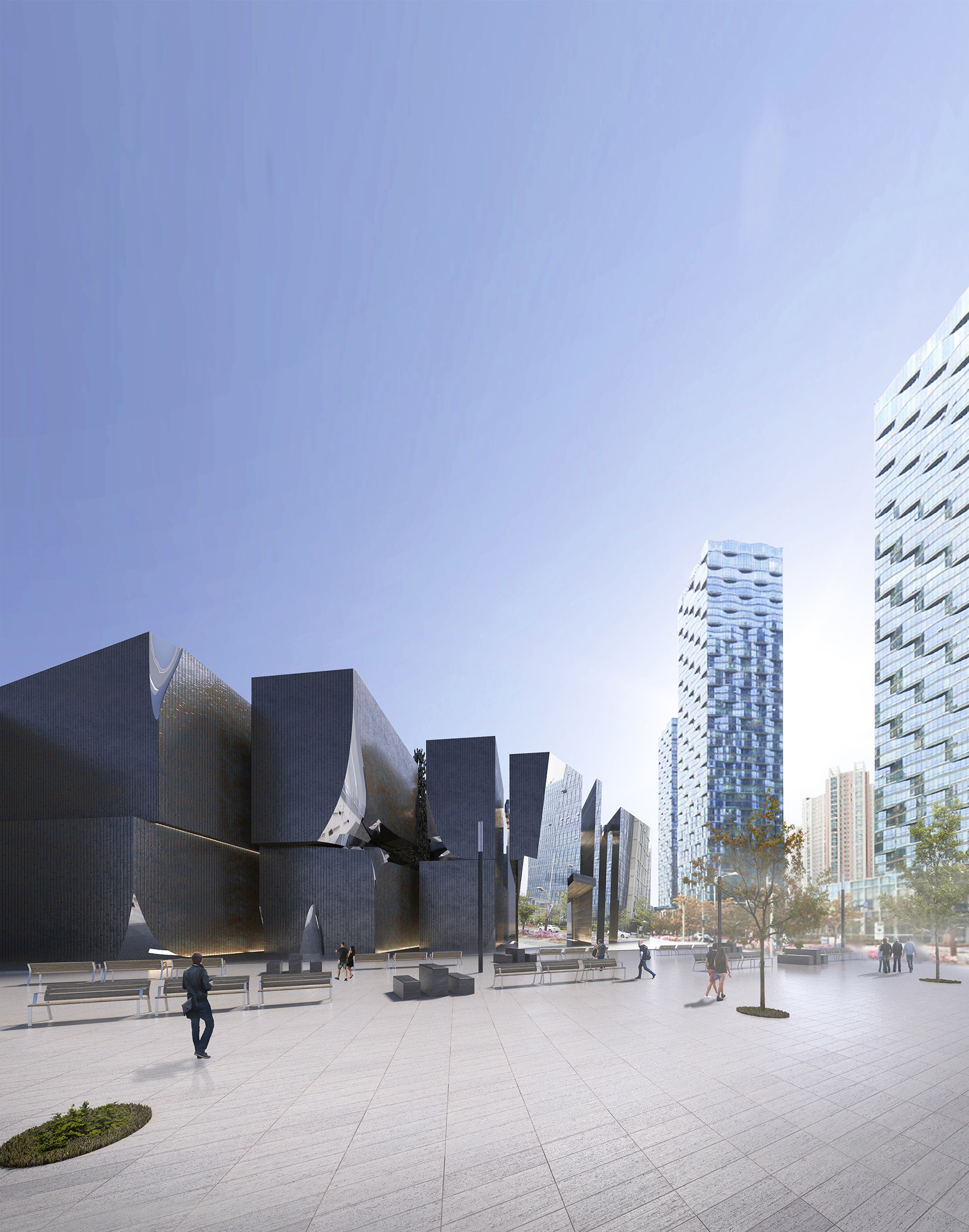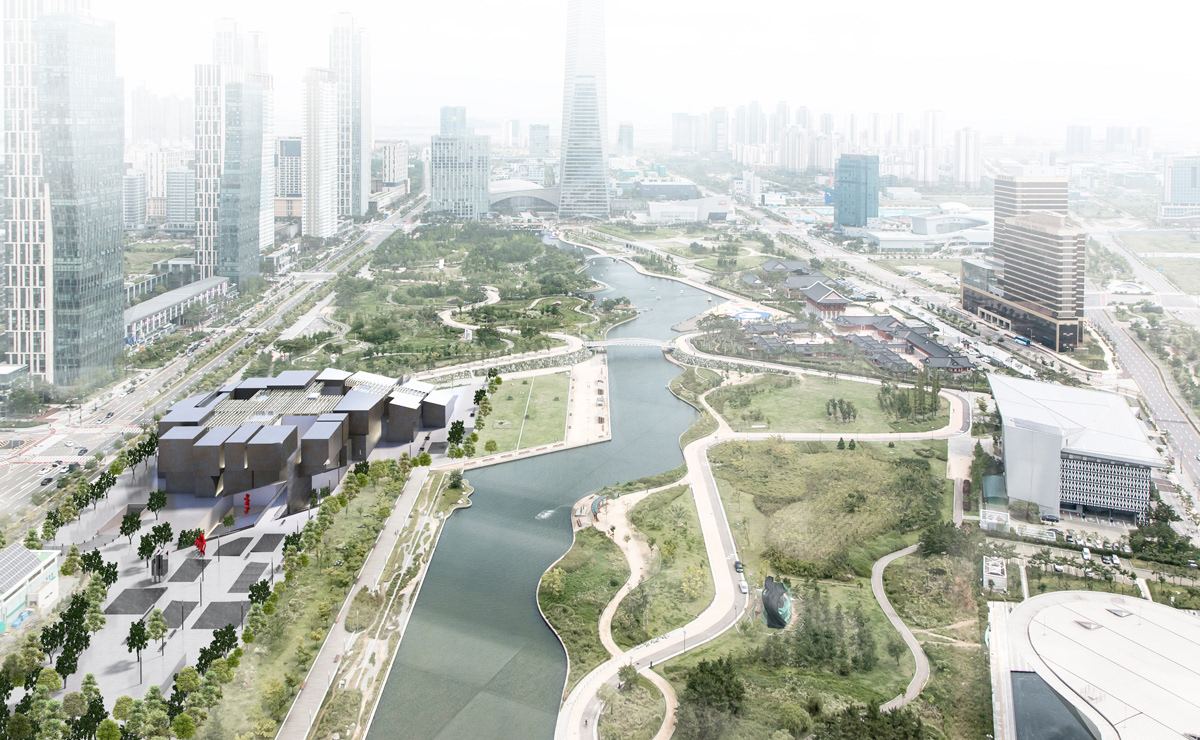 The museum was to morphologically embody the universal principles in writing, while using a formfinding process with environmental simulations. The collection of individual masses was created to metaphorically represent the universal morphology in all writing system. The gaps among masses were designed to open up the building and to connect the visitors to the surrounding landscape and waterscape with the view and the flow of natural air. The main roof emulated the common shape in printing blocks, which environmentally can control light and heat for the exhibit space below. Hard materials, such as metal cladding and stone walls, were chosen, referring to stone tablets as the writing medium for preserving knowledge in both the Aancient and modern societies.
