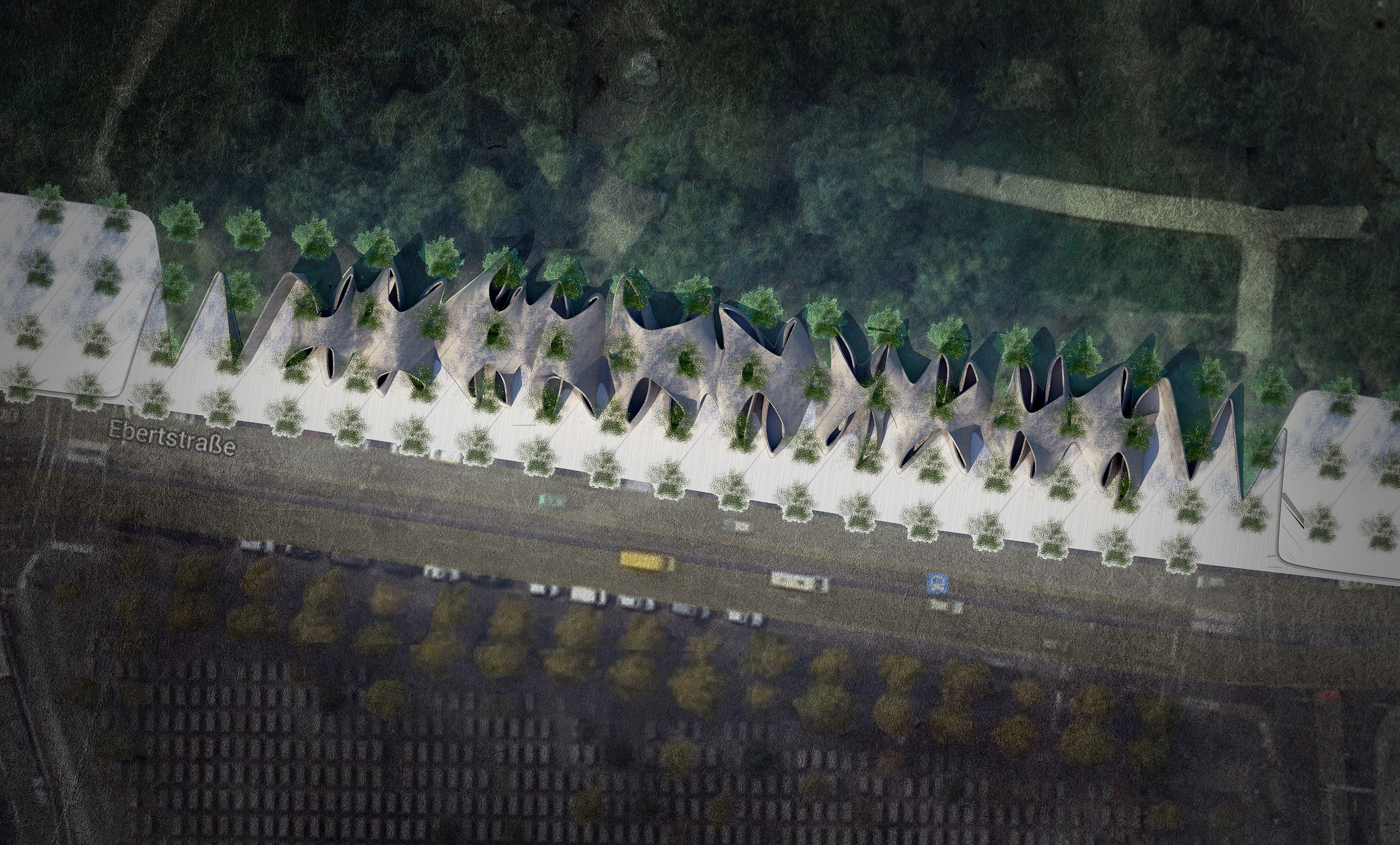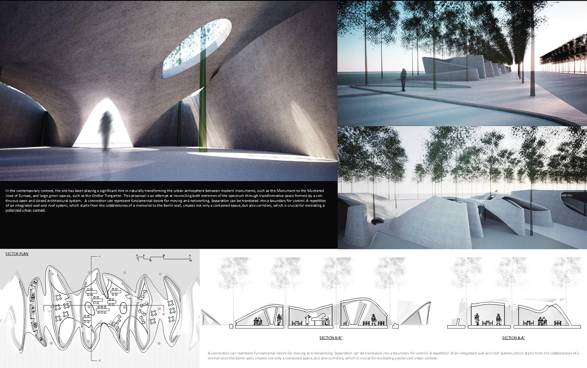 In the contemporary context, the site has been playing a signifi cant role in naturally transforming the urban atmosphere between modern monuments, such as the Monument to the Murdered Jews of Europe, and large green spaces, such as the Großer Tiergarten. This proposal is an attempt at reconciling both extremes of the spectrum through transformative space formed by a continuous open and closed architectural system.